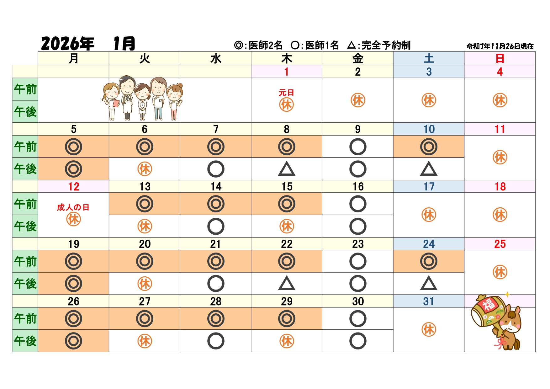 診療カレンダー(Dr.2診診療日・休診日)